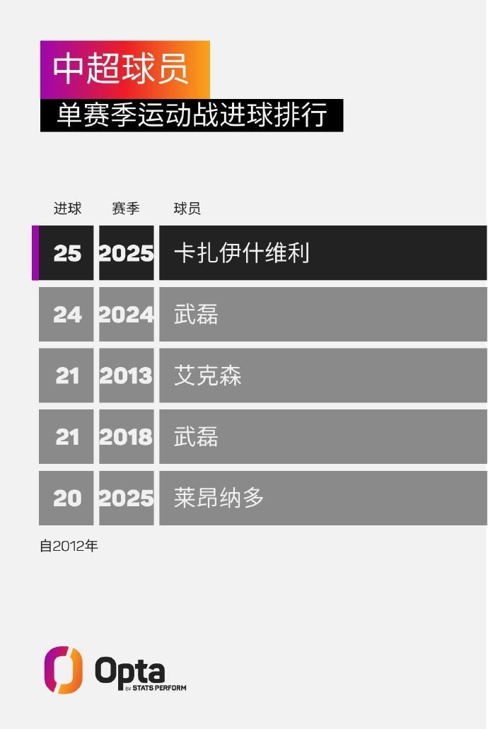 25 – 卡扎伊什维利本赛季在运动战中攻入25粒进球,刷新自有纪录以来(2012年),任一球员单赛季中超运动战进球新高。
